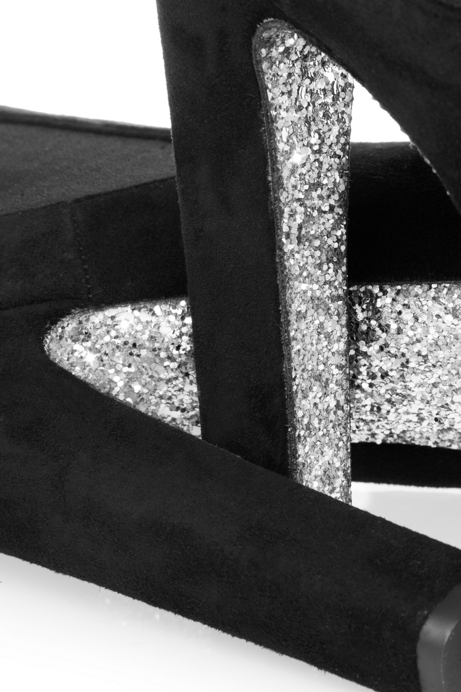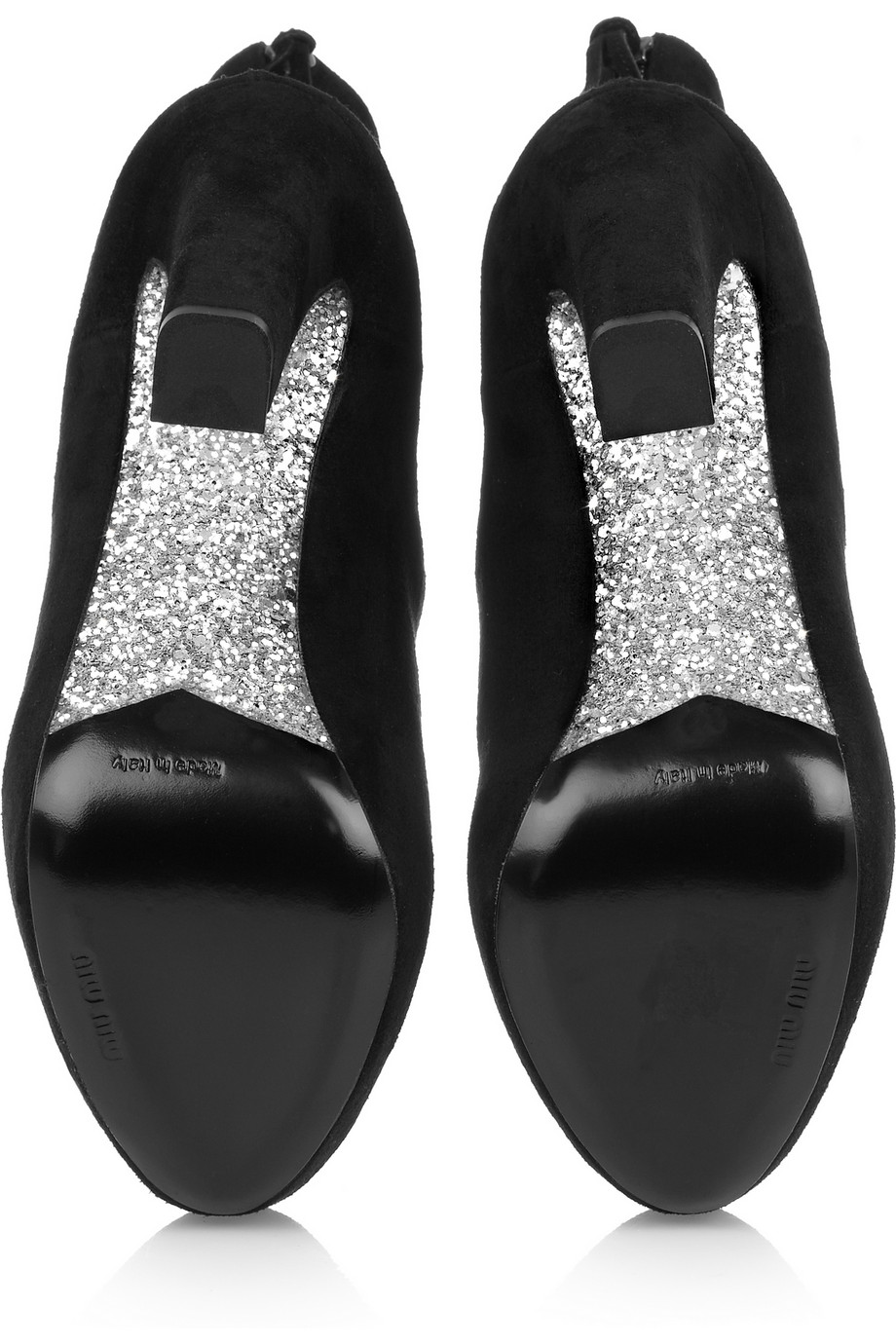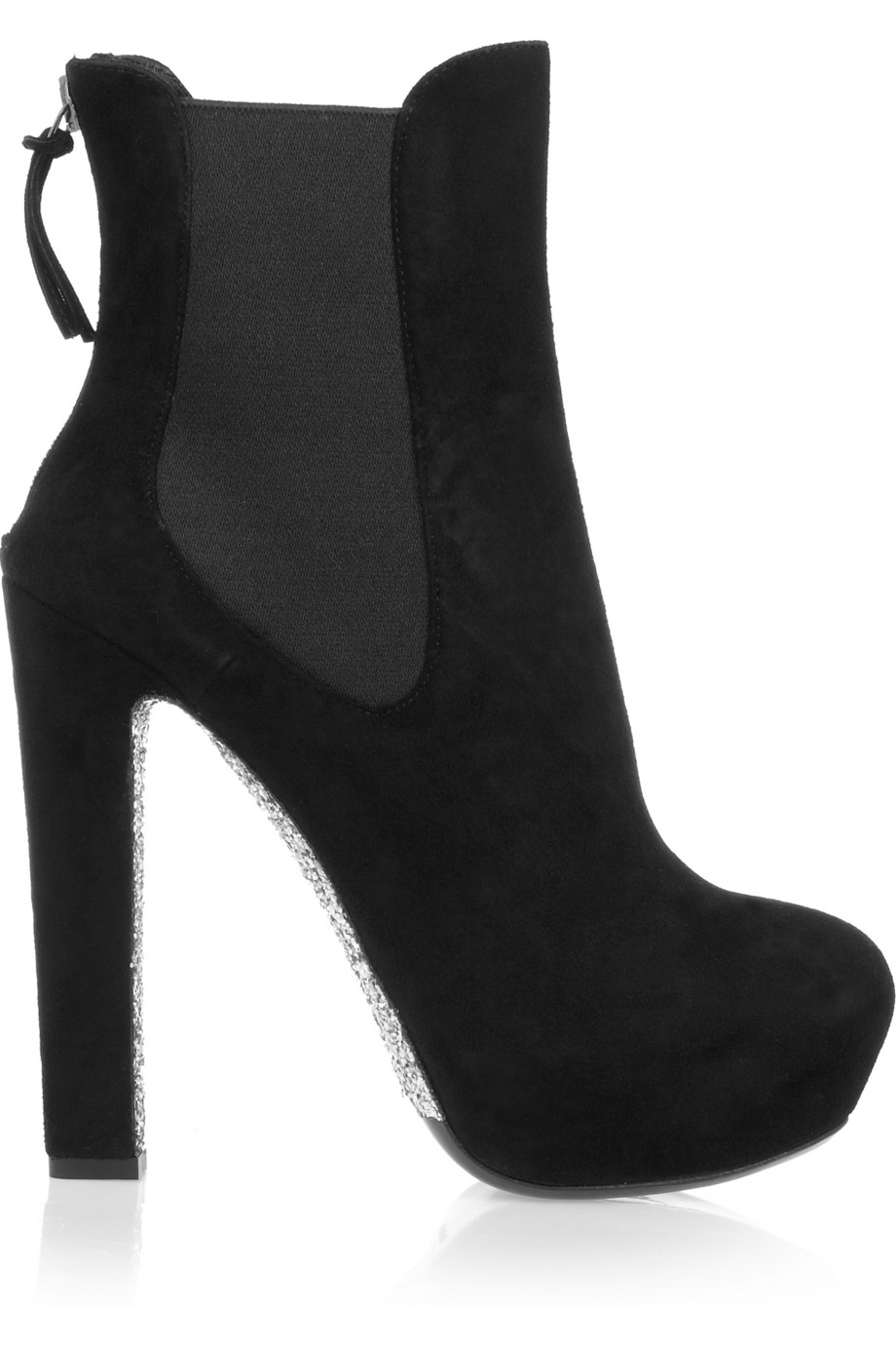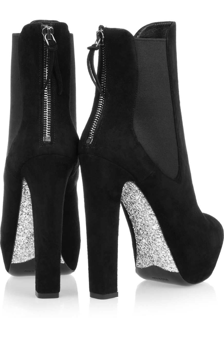 Features suede upper, elasticized sides, silver glittered sole, exposed zipper at back, 5.5″ heels, and 1.5″ platform. Retailed at $875 and available at NET-A-PORTER.