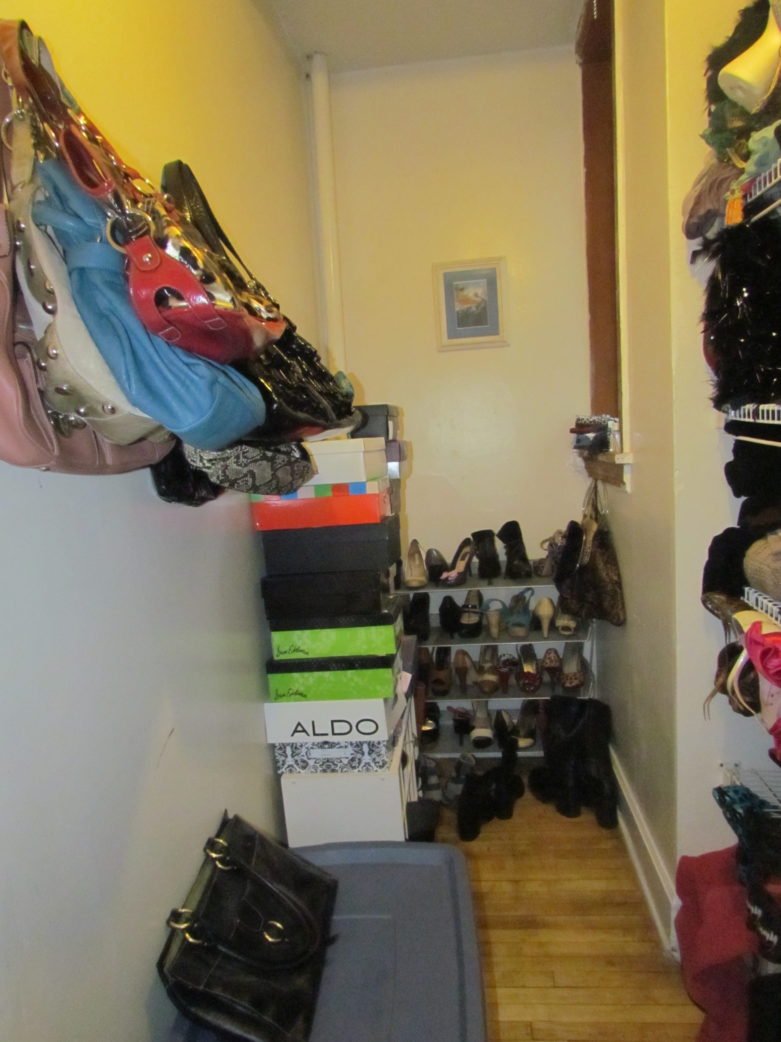 (Cat) If I have a theme it’s “Where the hell are these going to go?” I live in Chicago, and closet space is not something you come across easily here. Lucky for me I have this weird little closet/room in my place that is now filled with shoes. They’re on racks, in boxes, hanging, on shelves and in a giant blue Tupperware tub (I try to rotate seasonally). The closet is also really narrow, and often becomes littered with heels, turning it into some kind of fun house death trap.